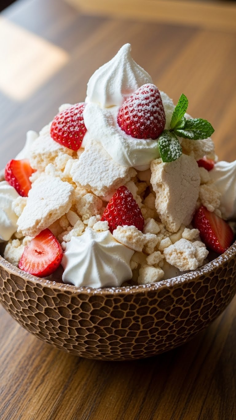 Eton Mess is delightfully chaotic—crunchy meringue, whipped cream, and juicy strawberries combine in each bite. It’s quick to assemble and best eaten right away. The flavors are sweet, tangy, and airy, with crunchy and creamy textures. You’ll smell vanilla and ripe strawberries as you toss it together.