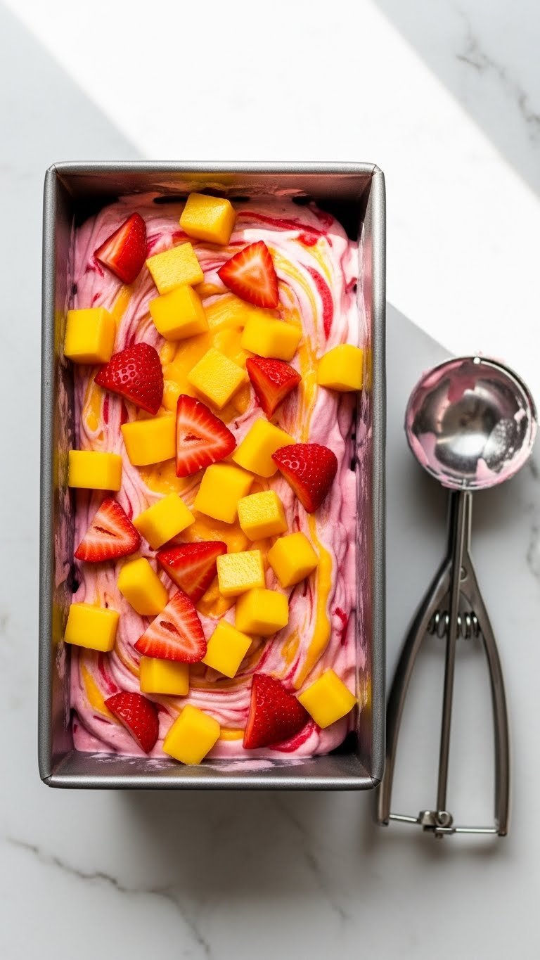 Scoop into chilled bowls and top with fresh mango and strawberry slices. Pair with shortbread cookies or coconut tuiles. For adult gatherings, serve with a shot of rum or sparkling wine. Make the day before to serve at peak texture.