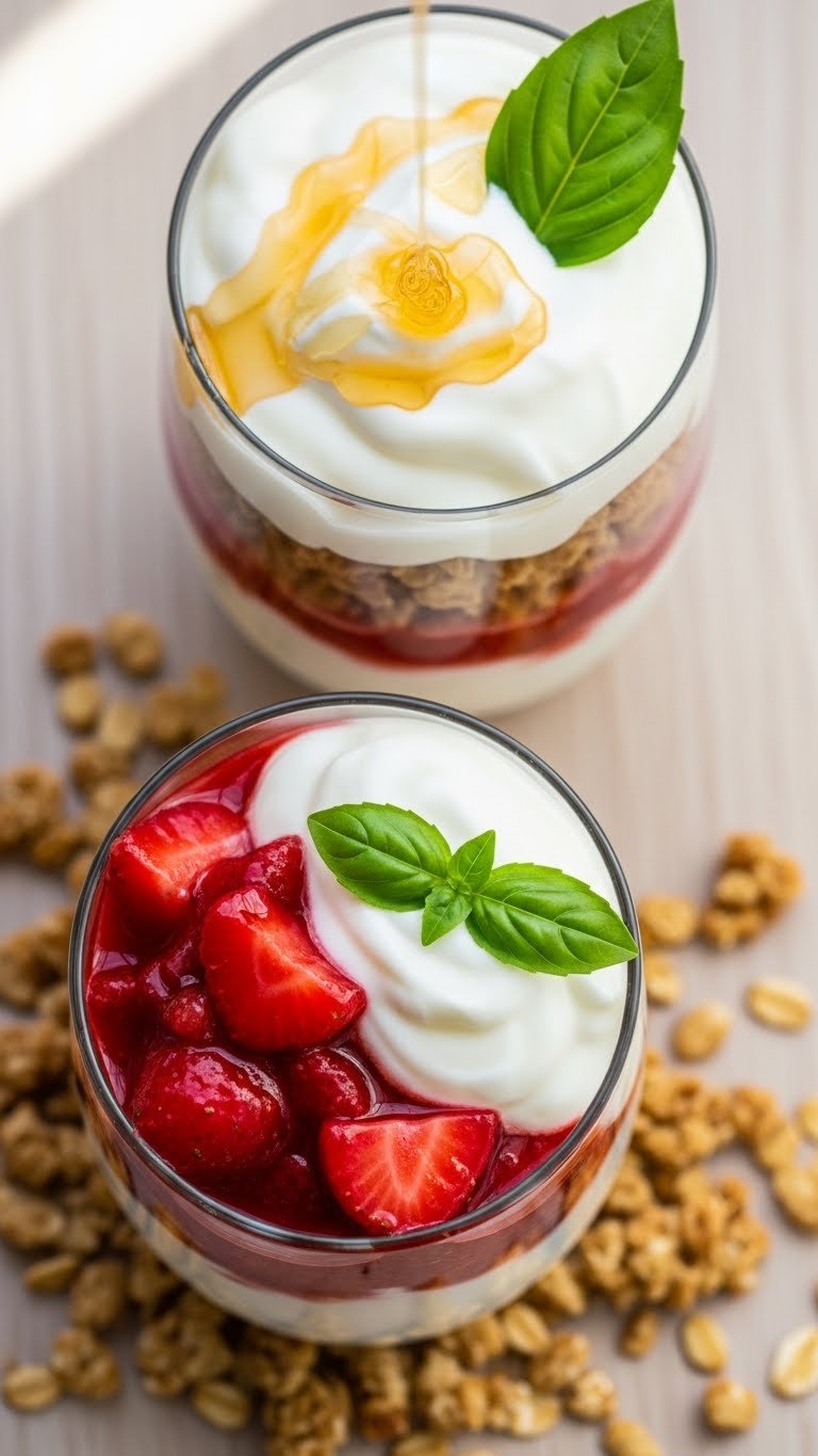 Fresh basil adds a savory-herbal note to sweet strawberries in these parfaits. Layers of creamy yogurt, crunchy granola, and bright compote give texture and balance. They’re great for brunch, dessert, or a hearty snack. You’ll love the fragrant basil and sweet-tart strawberry flavor. The crunch pairs perfectly with the cool, creamy yogurt.