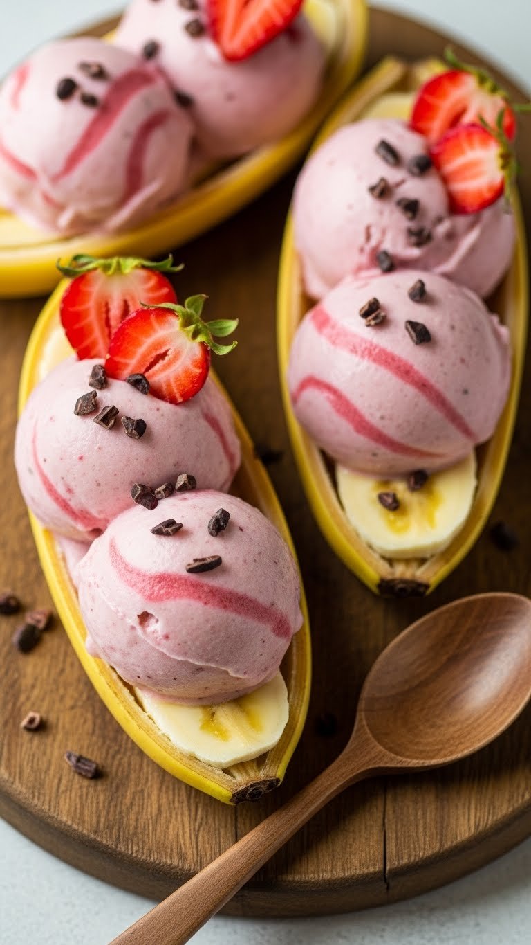 Nice cream is a simple frozen treat made from blended bananas. Adding strawberries yields a creamy, naturally sweet dessert without added dairy. It’s healthy and refreshing for hot days. The texture is smooth like soft-serve. You’ll taste ripe banana rounded by juicy strawberry tang and a cold, silky mouthfeel.