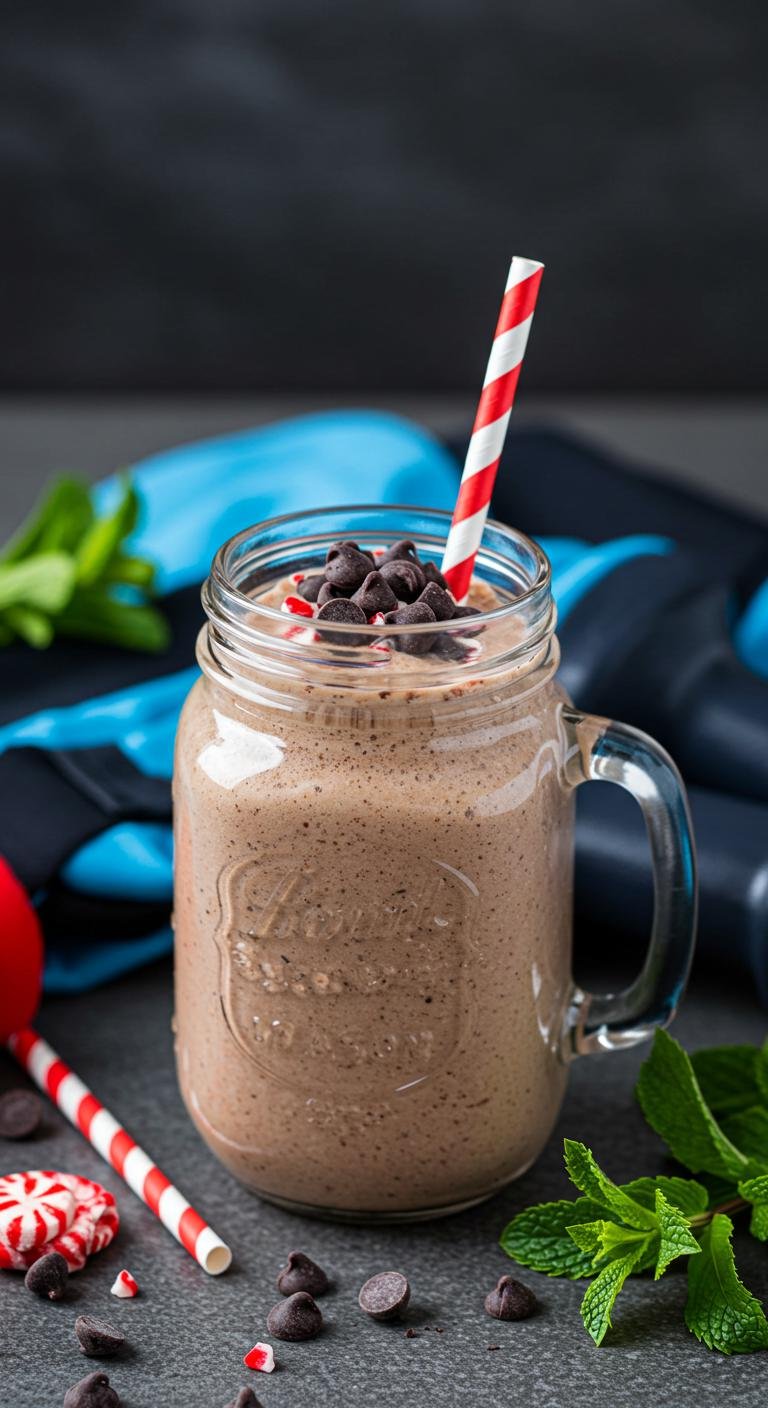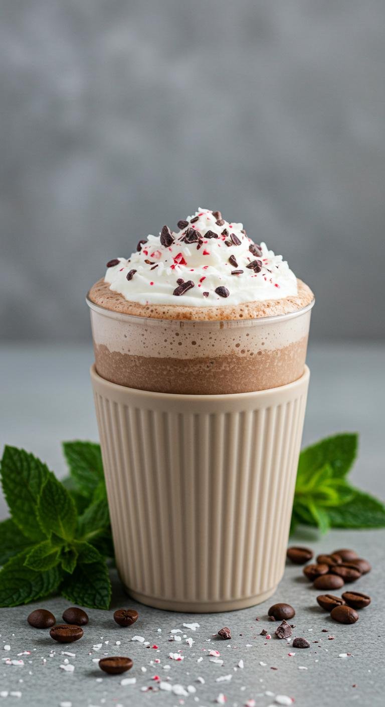 - Blend coffee, protein powder, almond milk, peppermint extract, and ice until smooth.