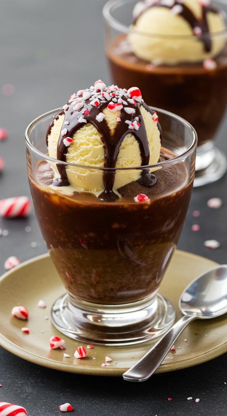 - Pour hot coffee over the ice cream and drizzle with chocolate sauce and peppermint syrup.