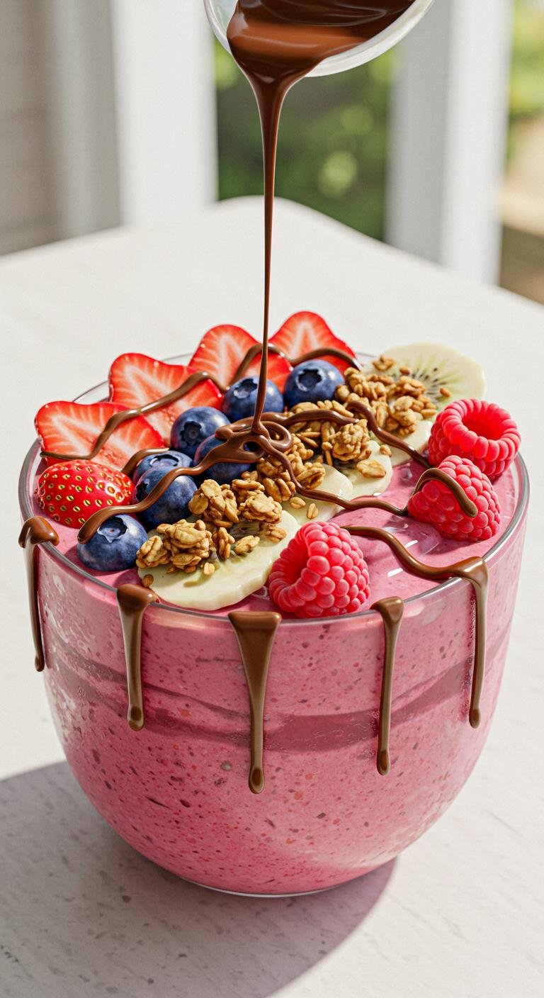 - Blend frozen banana, coffee, almond milk, cocoa powder, and peppermint extract until smooth.