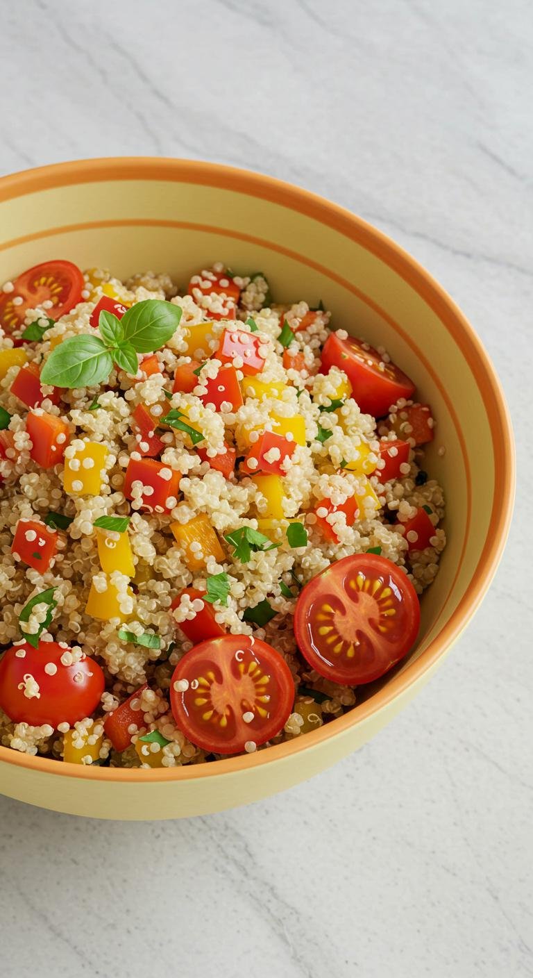 - In a bowl, combine quinoa, bell pepper, and tomatoes.