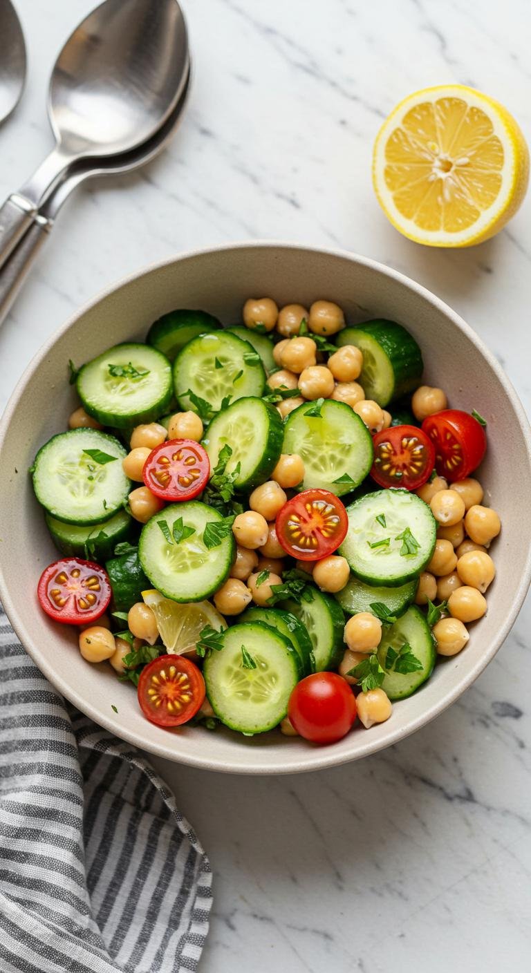 - In a bowl, combine chickpeas, cucumber, and tomatoes.