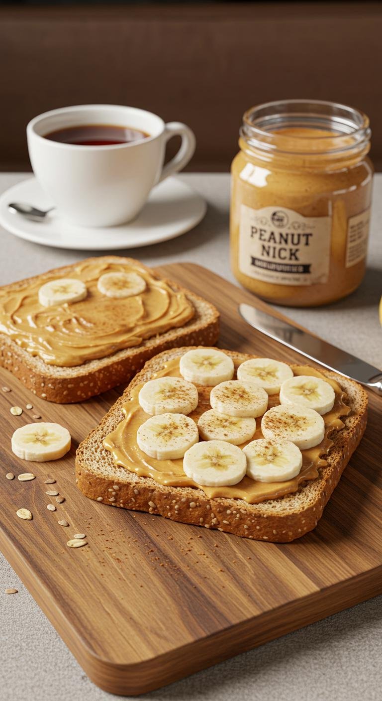 - Spread peanut butter and top with banana slices and a sprinkle of cinnamon.