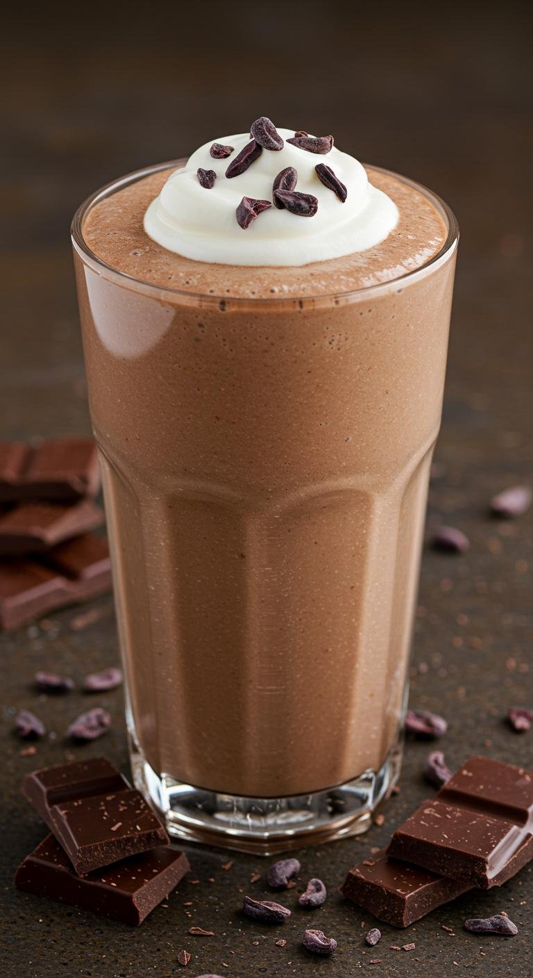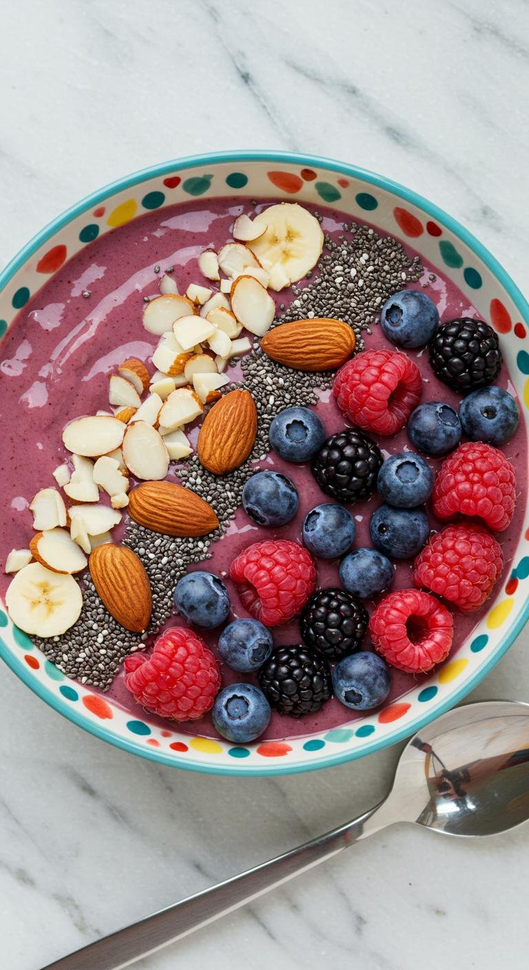 - Blend almond milk, mixed berries, and banana until smooth and thick.