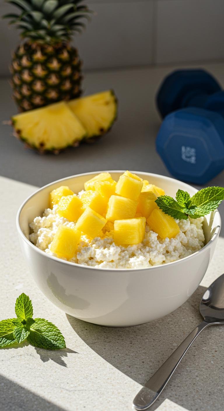 - In a bowl, combine cottage cheese with pineapple chunks.