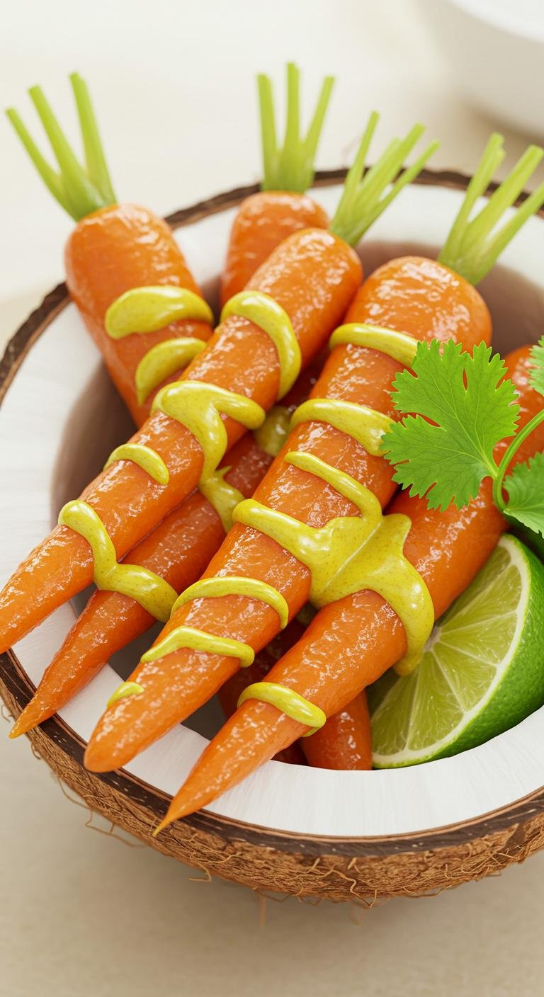 - Mix peanut butter, soy sauce, honey, and water to create a sauce; coat carrots.