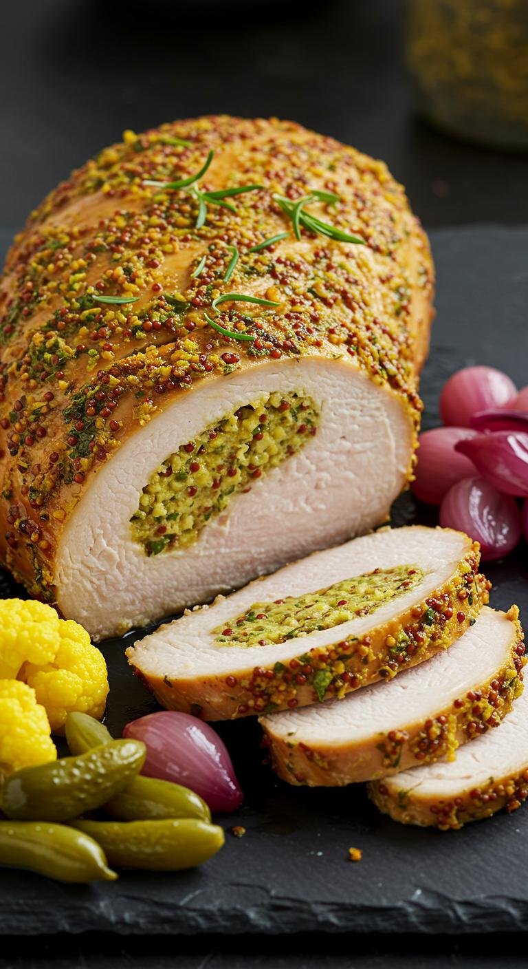 - Combine mustard, herbs, salt, and pepper. Spread over turkey, then coat with breadcrumbs.