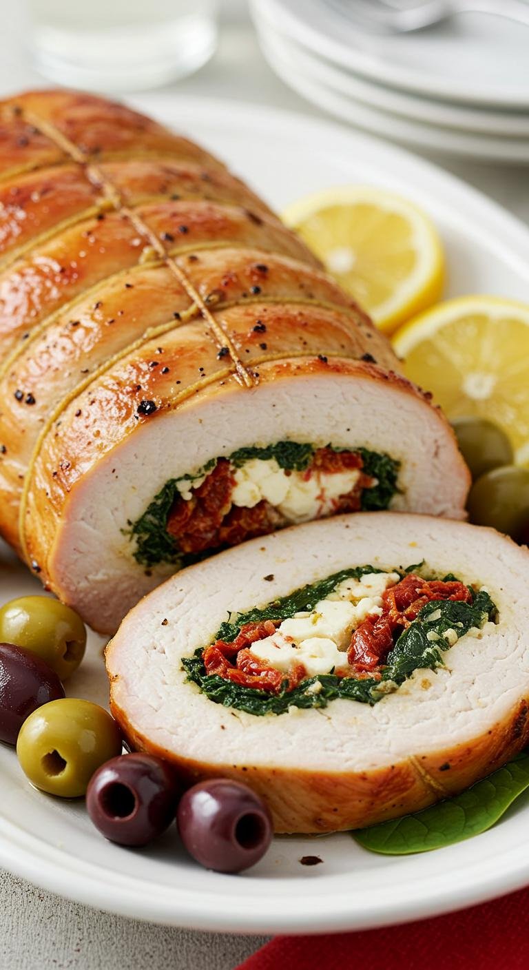 - Mix spinach, feta, tomatoes, salt, and pepper. Stuff turkey and secure.