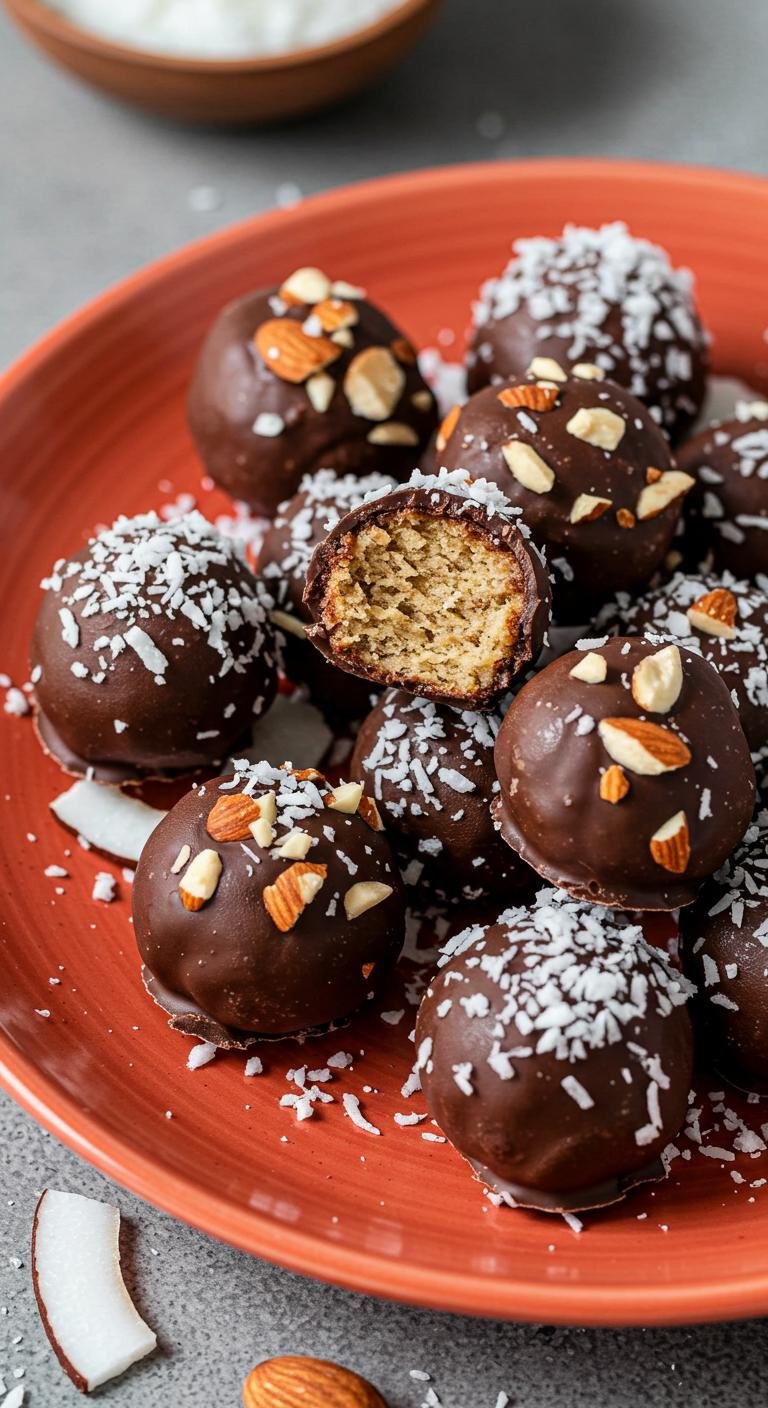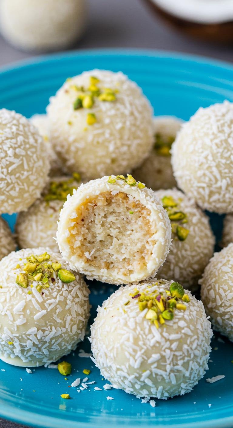 - Shape into balls, chill for 30 minutes, then roll in coconut and melted white chocolate.