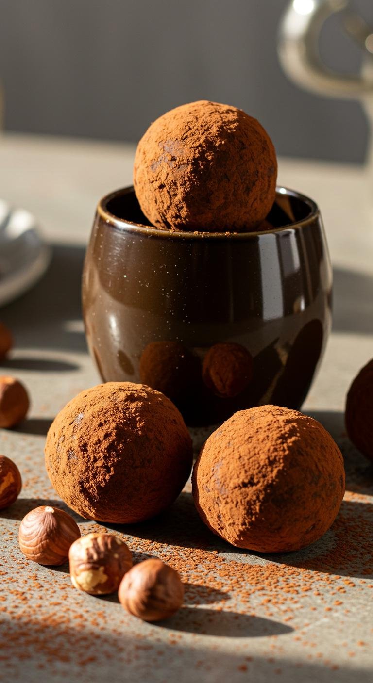 - Roll into balls, coat with crushed hazelnuts and cocoa powder.