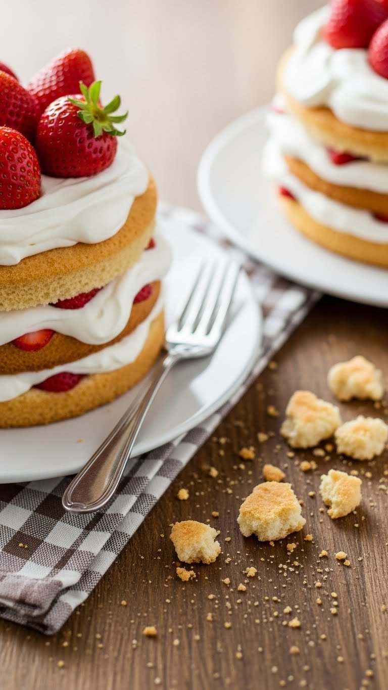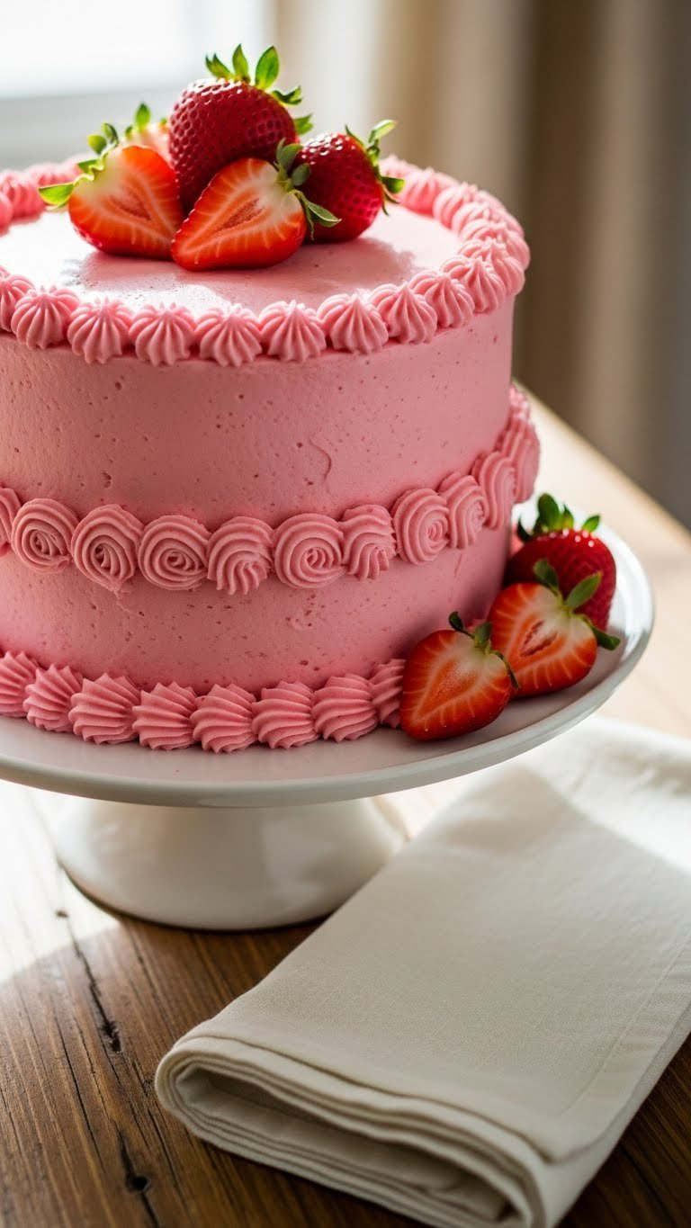Present the cake on a white stand for spring contrast. Garnish with whole strawberries and mint leaves. Pair with sparkling rosé or a chamomile tea. Store leftover slices in an airtight container in the fridge up to 3 days. To make ahead, bake layers and freeze wrapped for 2 weeks; thaw before assembling. Serve at room temperature for best flavor.