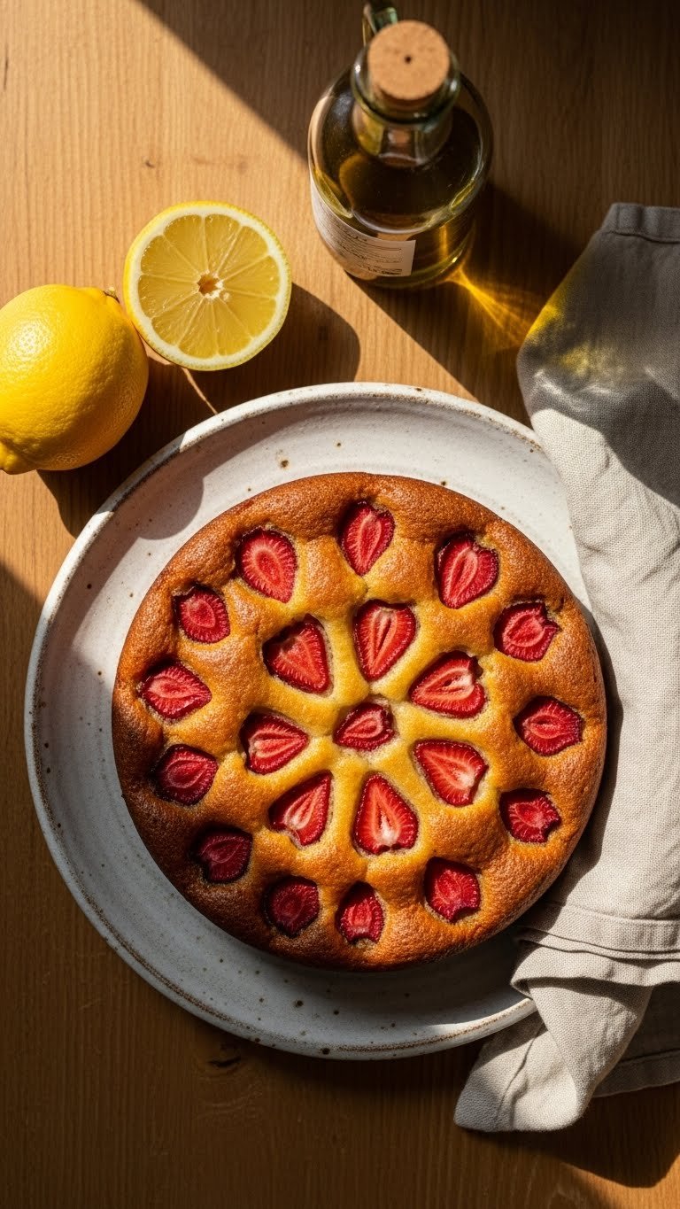 This lemon-strawberry olive oil cake balances bright citrus with juicy strawberries and silky olive oil crumb. It's moist and slightly dense, with a glossy lemon glaze. The cake feels relaxed and perfect for spring coffee hours or garden parties. You’ll notice a clean lemon aroma and a tender, olive-oil richness.