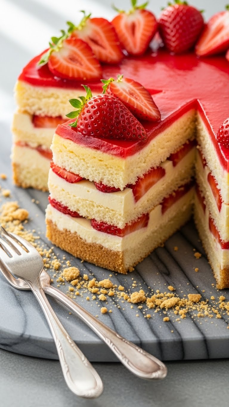 This hybrid cake stacks baked cheesecake layers with tender sponge and strawberry jam. It’s rich, creamy, and celebratory while still feeling seasonal. The contrast between silky cheesecake and airy cake is lovely. You'll get tangy cream cheese notes and a burst of fresh strawberry.