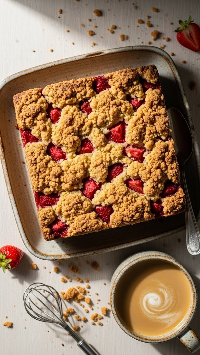 This strawberry crumb coffee cake has buttery streusel and juicy berry pockets. It’s tender, slightly dense, and studded with strawberries that soften as it bakes. Perfect for spring brunch or a tea party. You’ll notice cinnamon-sugar crumbs and soft, fruity center bites.