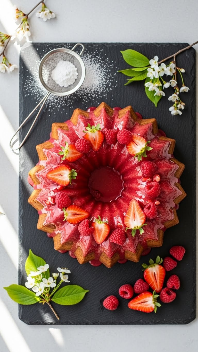 This bundt cake has tender crumb flavored with strawberry purée and finished with a glossy strawberry glaze. The ring shape makes it special for spring meals and celebrations. Expect a moist interior, golden crust, and bright glaze that highlights fresh berries.
