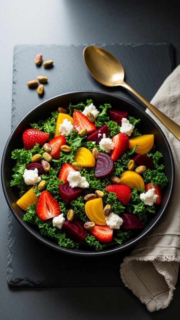 You’ll taste chewy kale, tender beets, and crunchy pistachios. It’s hearty enough for lunch or as a side for roasted meats. You’ll like it if you want bold textures and deep flavors.
