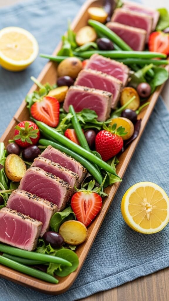 This playful Nicoise twist swaps tomatoes for strawberries and uses a strawberry balsamic vinaigrette. Seared tuna adds elegant protein and texture.
