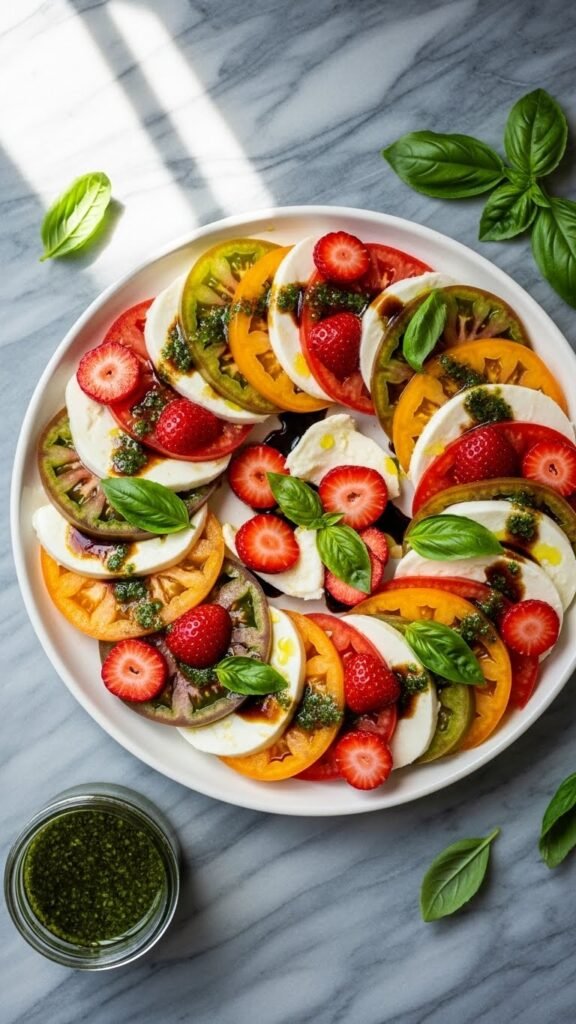 9. Strawberry Balsamic Caprese Salad with Heirloom Tomatoes and Basil Oil
