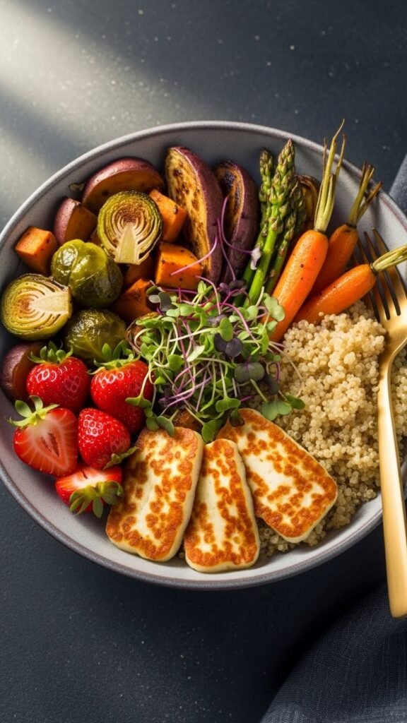 Serve warm in bowls and add a squeeze of lemon if you like extra brightness. Pair with a medium-bodied white wine or chilled cider. Store components separately; quinoa and roasted vegetables keep up to 3 days refrigerated. Reheat veggies and halloumi briefly before assembling.