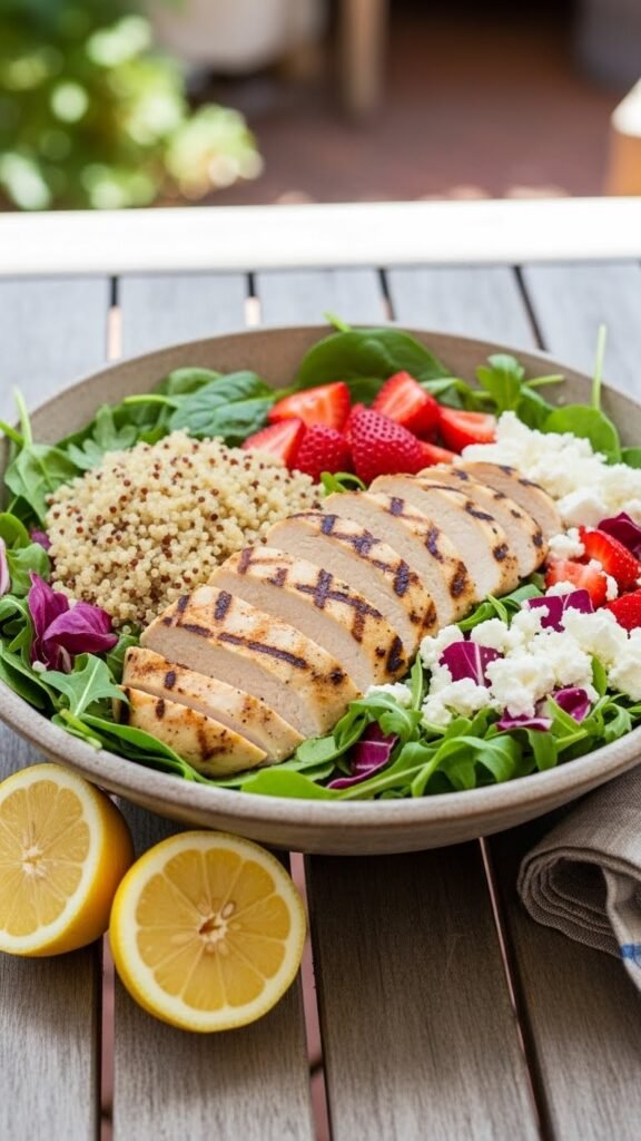 Serve in deep bowls with chicken fanned across. Garnish with extra strawberries and lemon wedges. Pair with a chilled rosé or iced tea. Store leftovers with dressing separate up to 3 days. Make quinoa and dressing ahead for quick assembly.