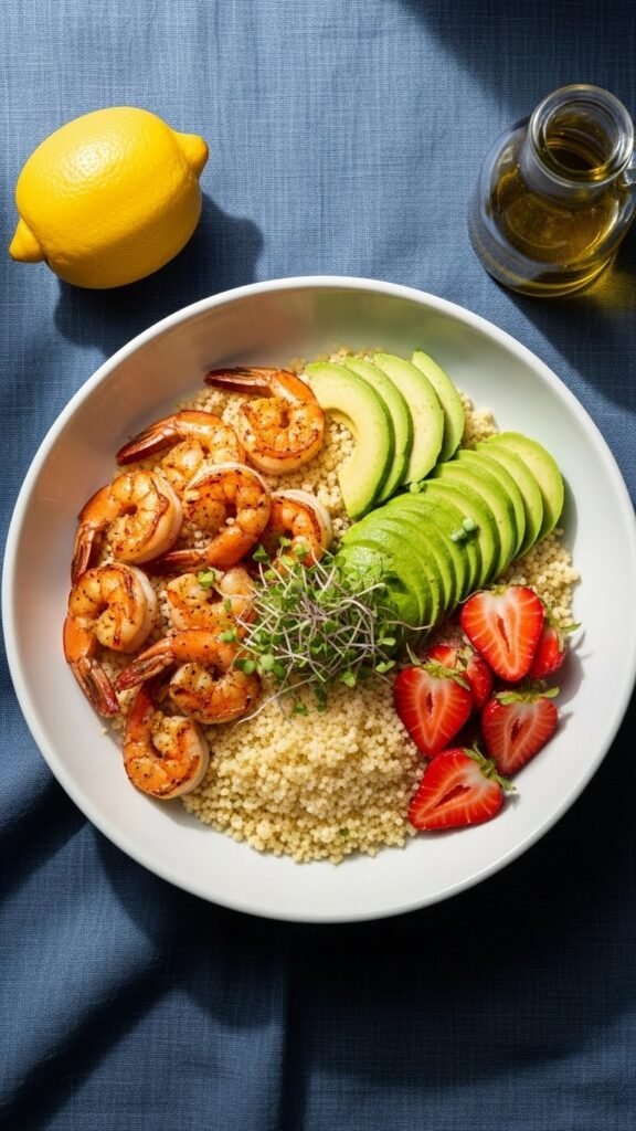 This salad swaps chicken for lightly spiced shrimp and adds creamy avocado. Couscous gives a tender grain base that soaks up the strawberry balsamic dressing.
