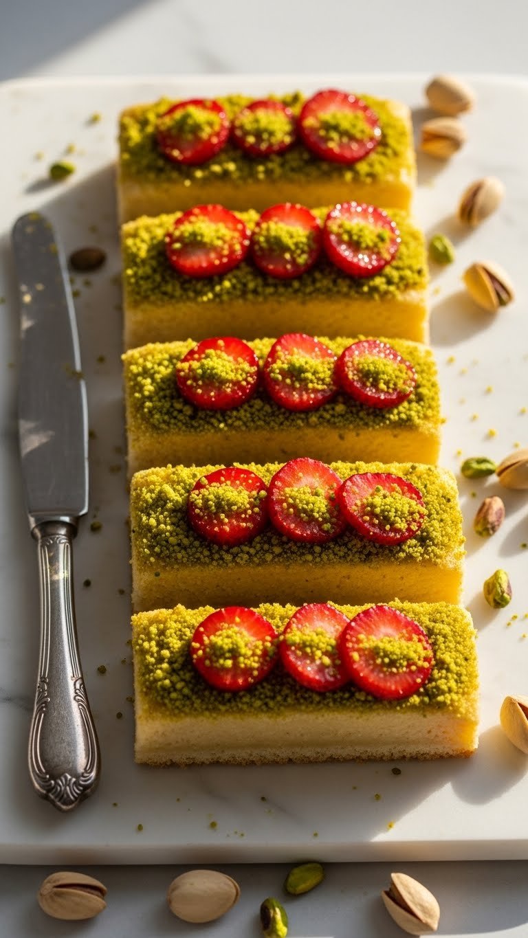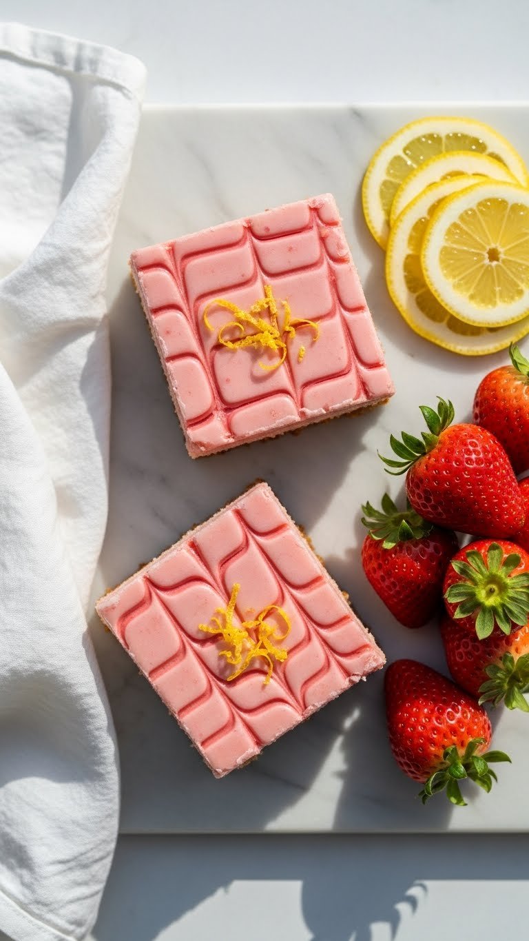 Serve chilled or at cool room temperature. Garnish with a light dusting of powdered sugar and a mini strawberry slice. Pair with coffee or a bright citrus tea. For travel, keep chilled and pack with a small ice pack. Bars are best made a day ahead.