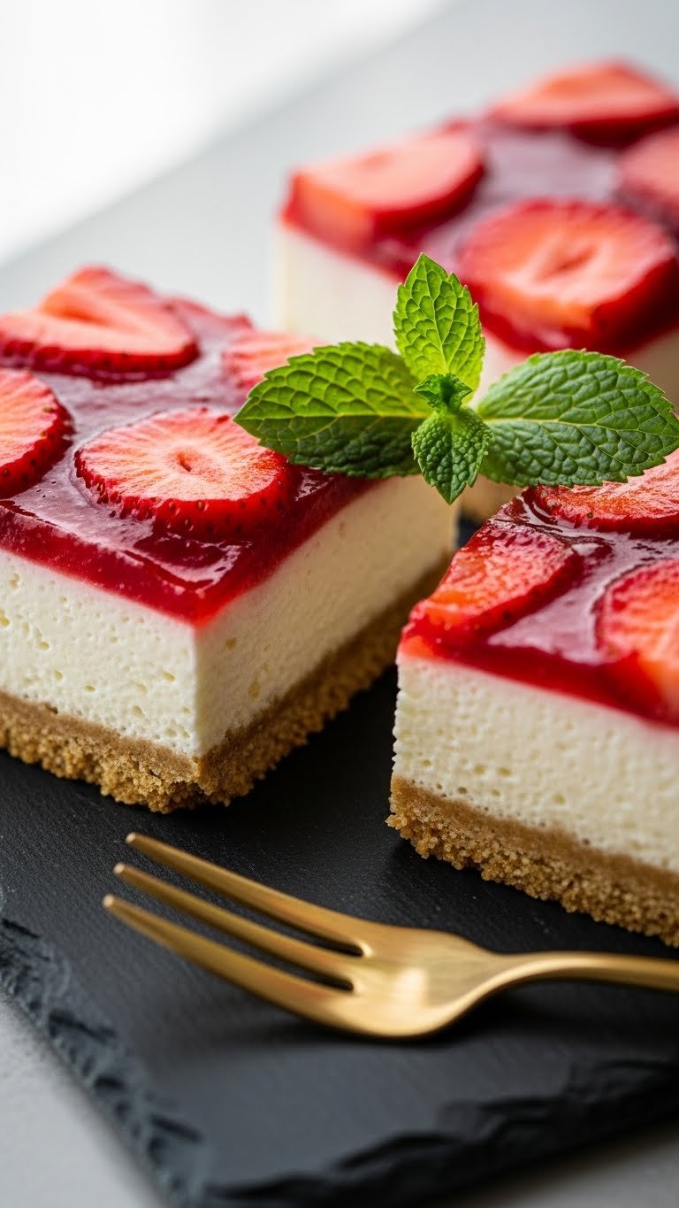 Serve cold on chilled plates or in a portable cooler. Garnish each bar with a small mint leaf and a fresh strawberry slice. Pair with sparkling water, iced coffee, or dessert wine. For travel, pack in a shallow container with ice packs. Make these a day ahead for best texture.