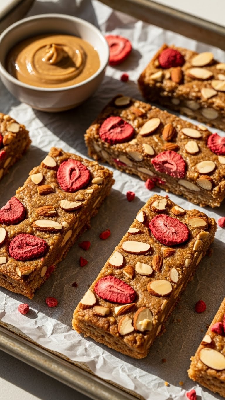 Wrap bars individually in parchment for easy grabs. Sprinkle extra crushed freeze-dried strawberries on top before slicing. Pair with coffee or a smoothie for an energizing snack. They’re travel-friendly and don’t need refrigeration for a day. Freeze extras for longer storage.