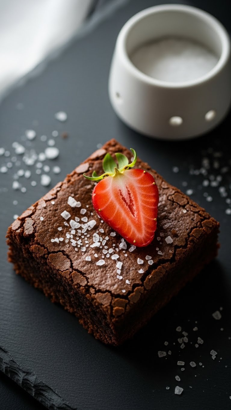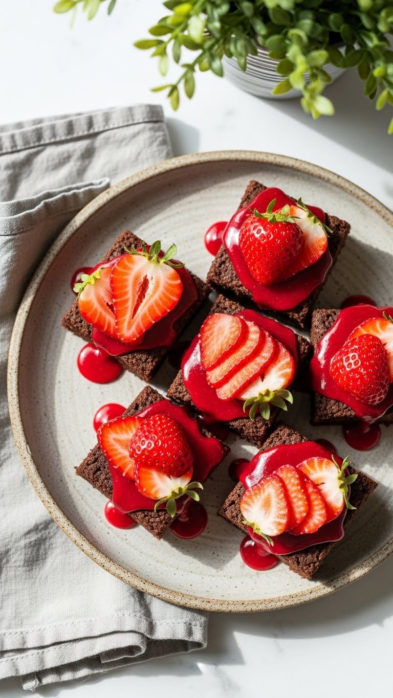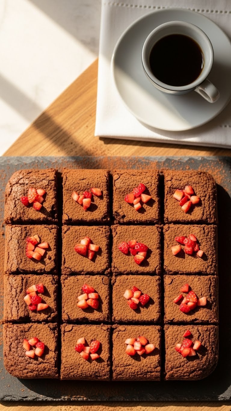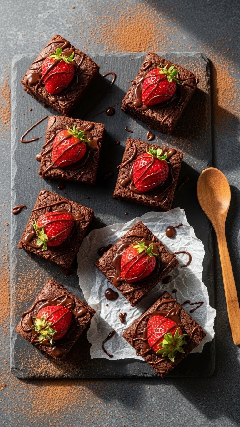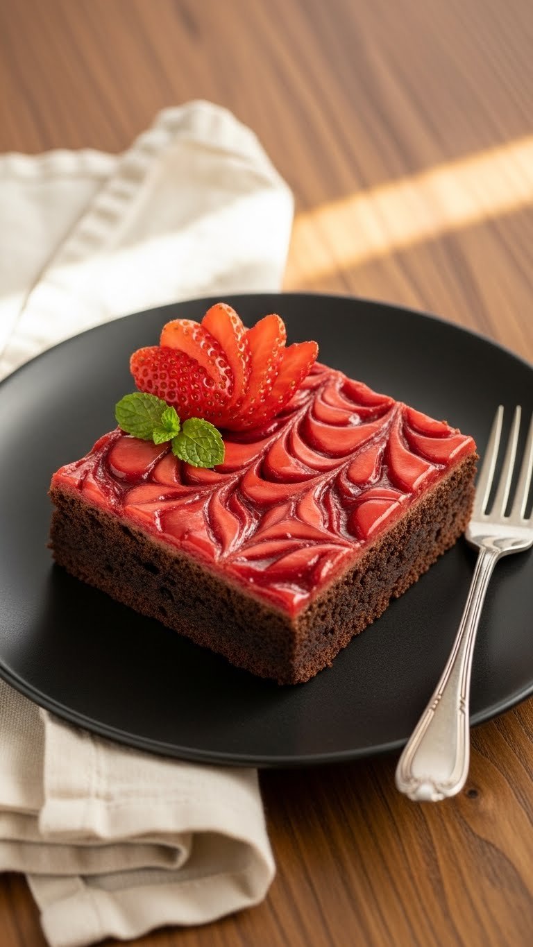 This version doubles the chocolate for a deeper fudge. Fresh strawberries on top add brightness and a juicy bite. The texture is dense and velvety, with a glossy top and chewy crumb.