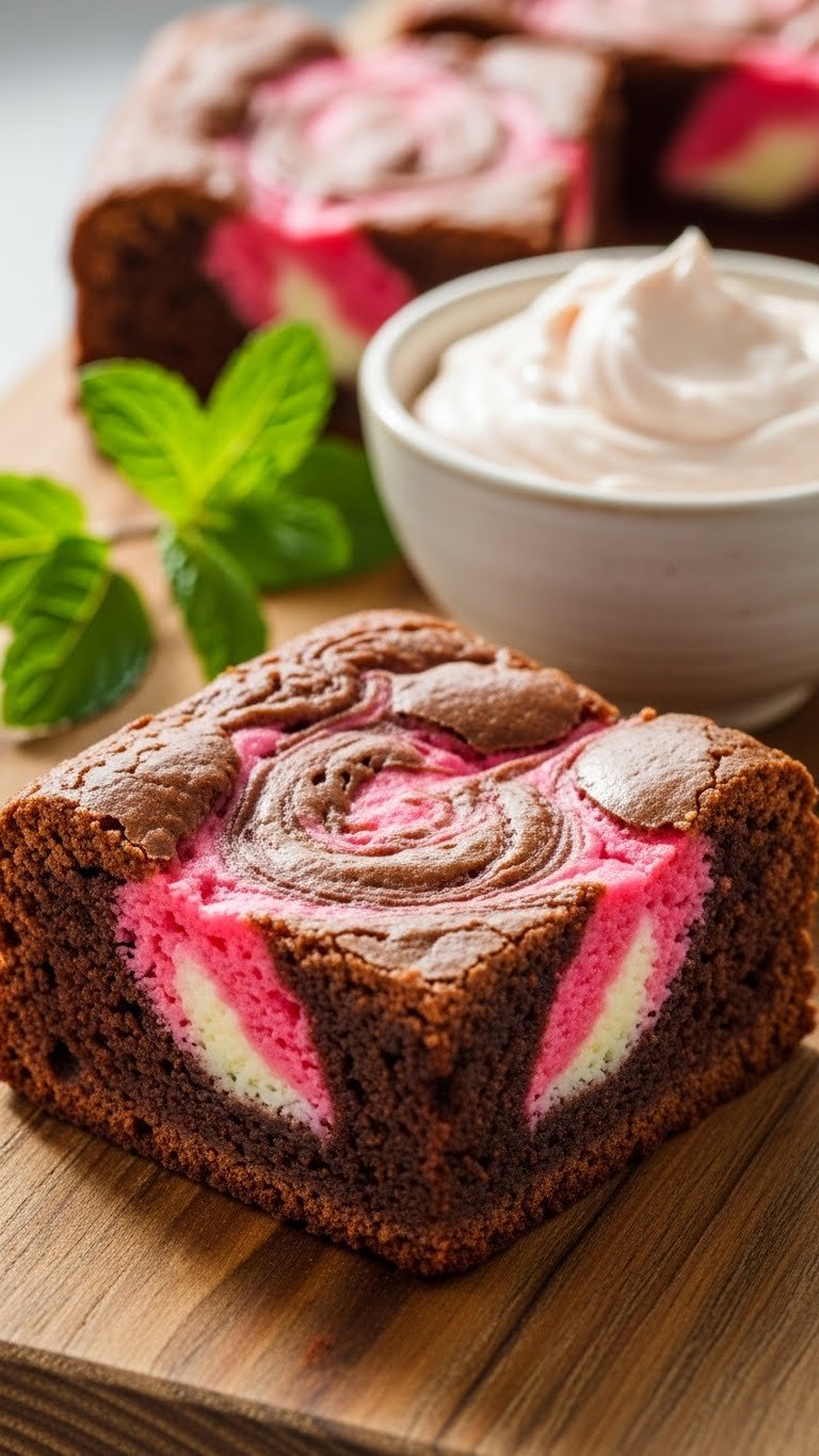 This brownie blends tangy cream cheese and strawberry jam into a marbled top. The filling adds a soft, silky contrast to the fudgy base. Texture alternates between dense chocolate and creamy pink ribbons.