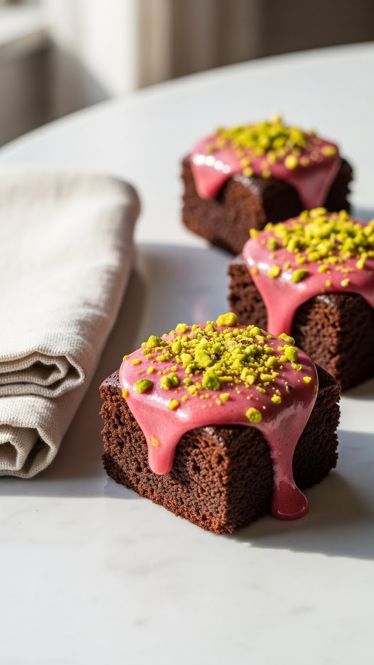 This recipe tops fudgy brownies with a silky strawberry ganache. The ganache brings a glossy finish and intense strawberry flavor. Texture is dense below and smooth on top.