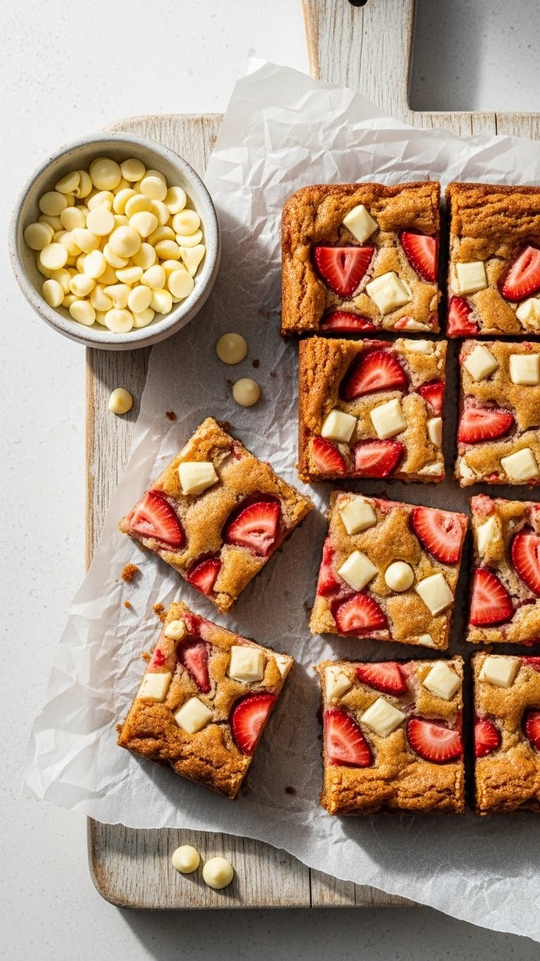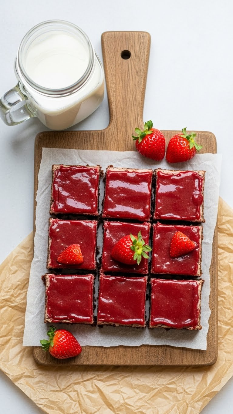 Serve squares on a white plate with a halved fresh strawberry. Dust lightly with powdered sugar for contrast. Pair with espresso or a strawberry iced tea. Store in an airtight container at room temperature for 3 days or refrigerated for 5 days. Cut into bars ahead and keep chilled for easier transport.