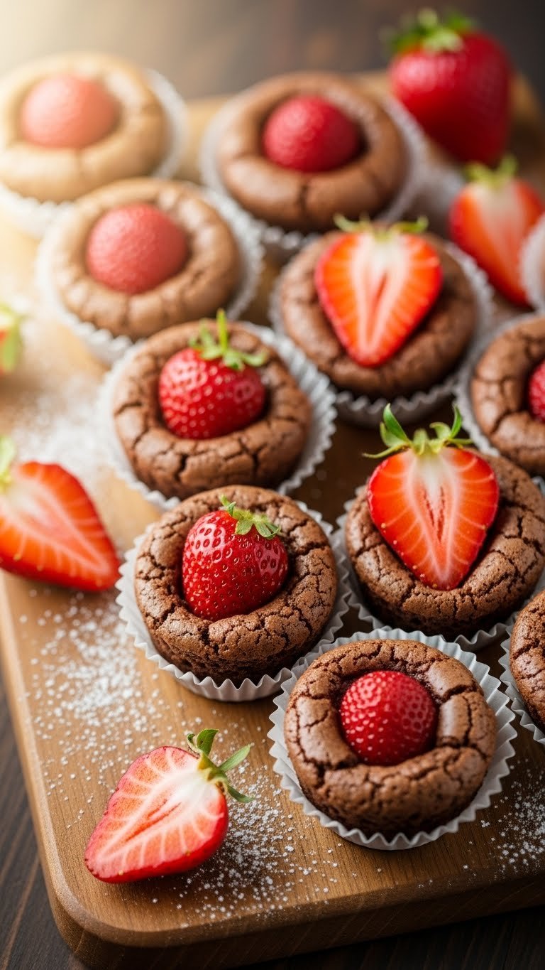 These bite-size brownies hide a sweet strawberry center. Each square has a pocket of jam or fresh berry for a fruity surprise. Texture stays dense and fudgy, with a soft core.
