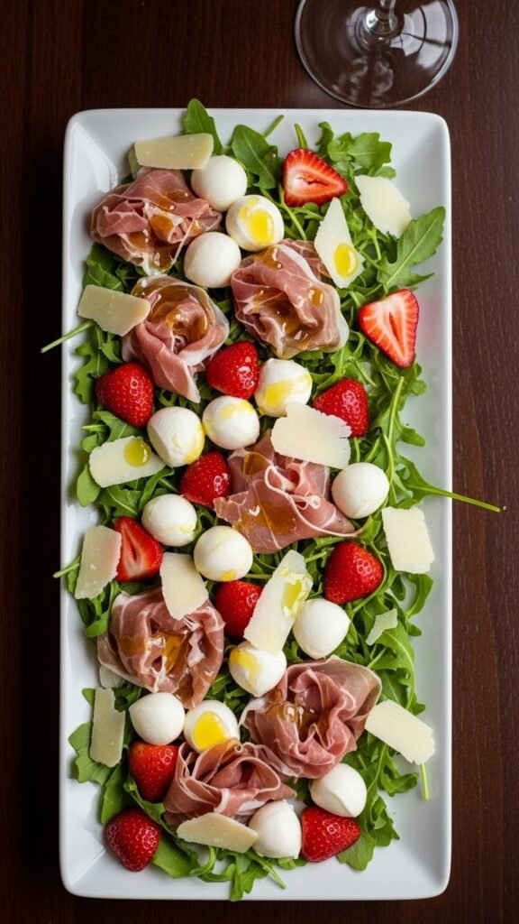 Salt-cured prosciutto adds savory contrast to sweet berries. Peppery arugula adds bite, and mozzarella keeps it creamy. This is a sophisticated salad for dinner guests. Expect a balance of sweet, salty, and peppery flavors. The aroma of cured meat and fresh herbs is appealing.