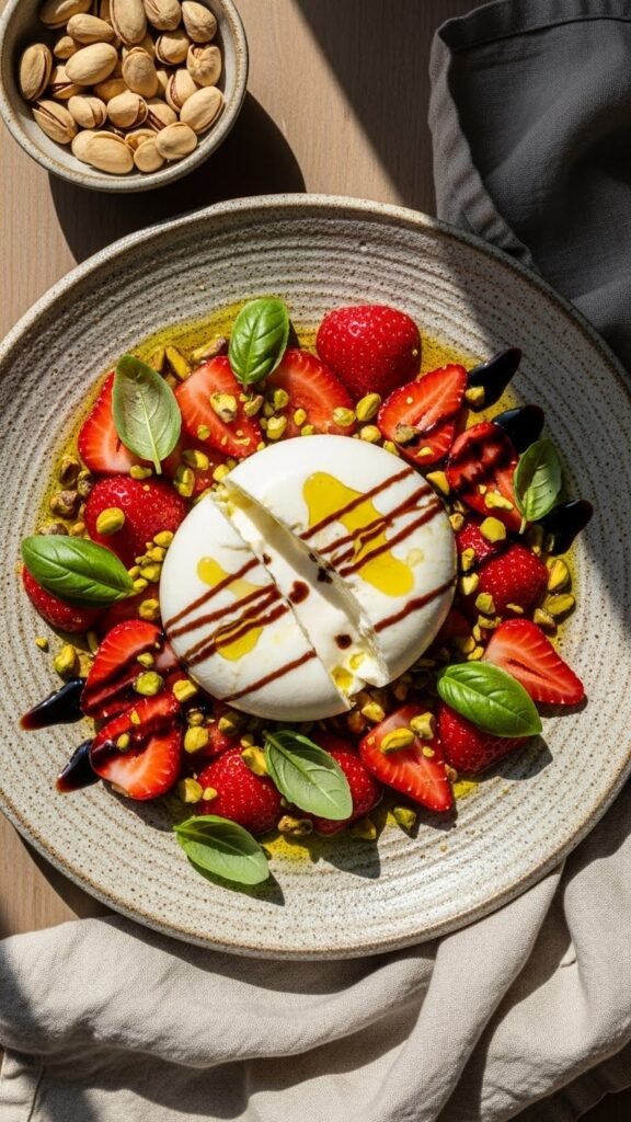 Serve on a shallow ceramic plate to showcase the burrata center. Add crusty bread for scooping. Pair with Champagne or a dry rosé. Eat within 2 hours after assembling for best texture. Make-ahead: chop pistachios and slice strawberries up to 2 hours ahead and refrigerate separately.