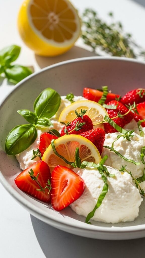 Whipped ricotta lightens the cheese layer and adds subtle tang. Lemon-thyme strawberries are bright and herb-forward. The mouthfeel is airy, creamy, and zesty. This is a refined side dish for spring lunches. You’ll notice floral thyme and citrus brightness.