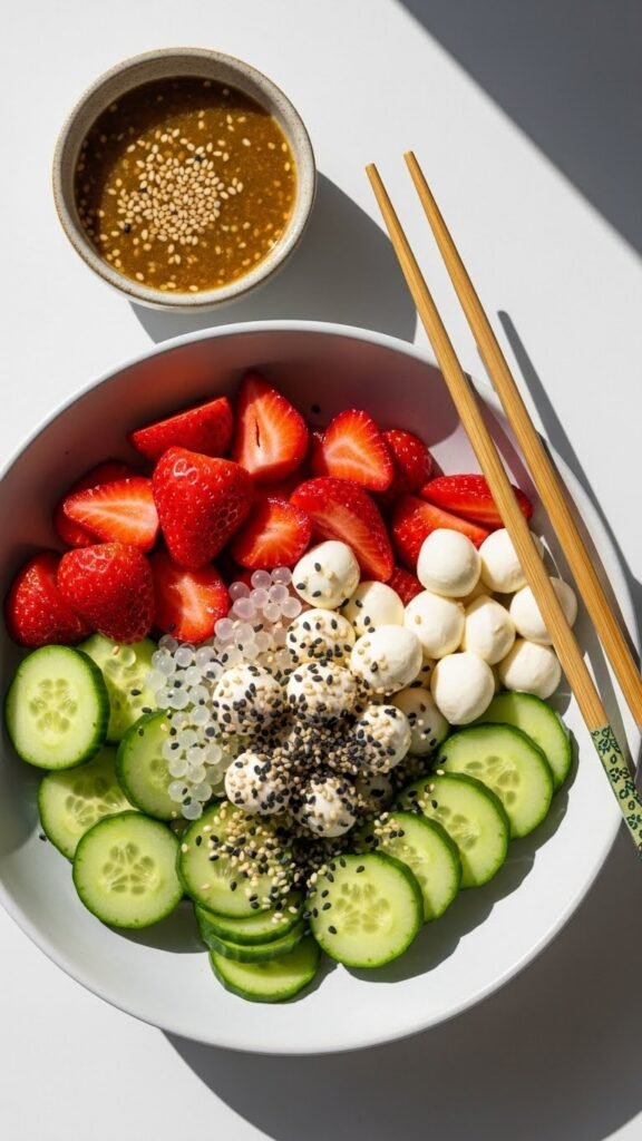 Ginger and sesame give a savory-sweet twist to Fresh Strawberry Caprese Salads. Thinly sliced cucumber adds crunch and coolness. Flavor is tangy, nutty, and fresh. This version pairs well with Asian-inspired mains. Expect a fragrant lift from sesame oil and ginger.