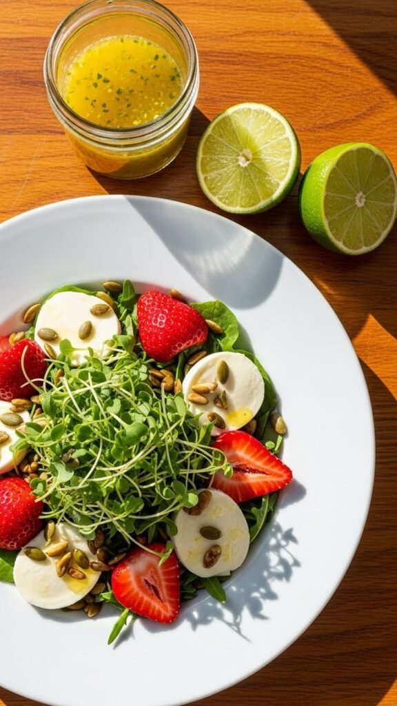 Serve on a simple white plate to show colors. Garnish with extra lime zest and a few whole strawberries. Pair with a citrus cocktail or light lager. Store in the fridge up to 24 hours; add pepitas at serving to keep them crisp. Make-ahead: toast pepitas and make dressing up to 2 days ahead.