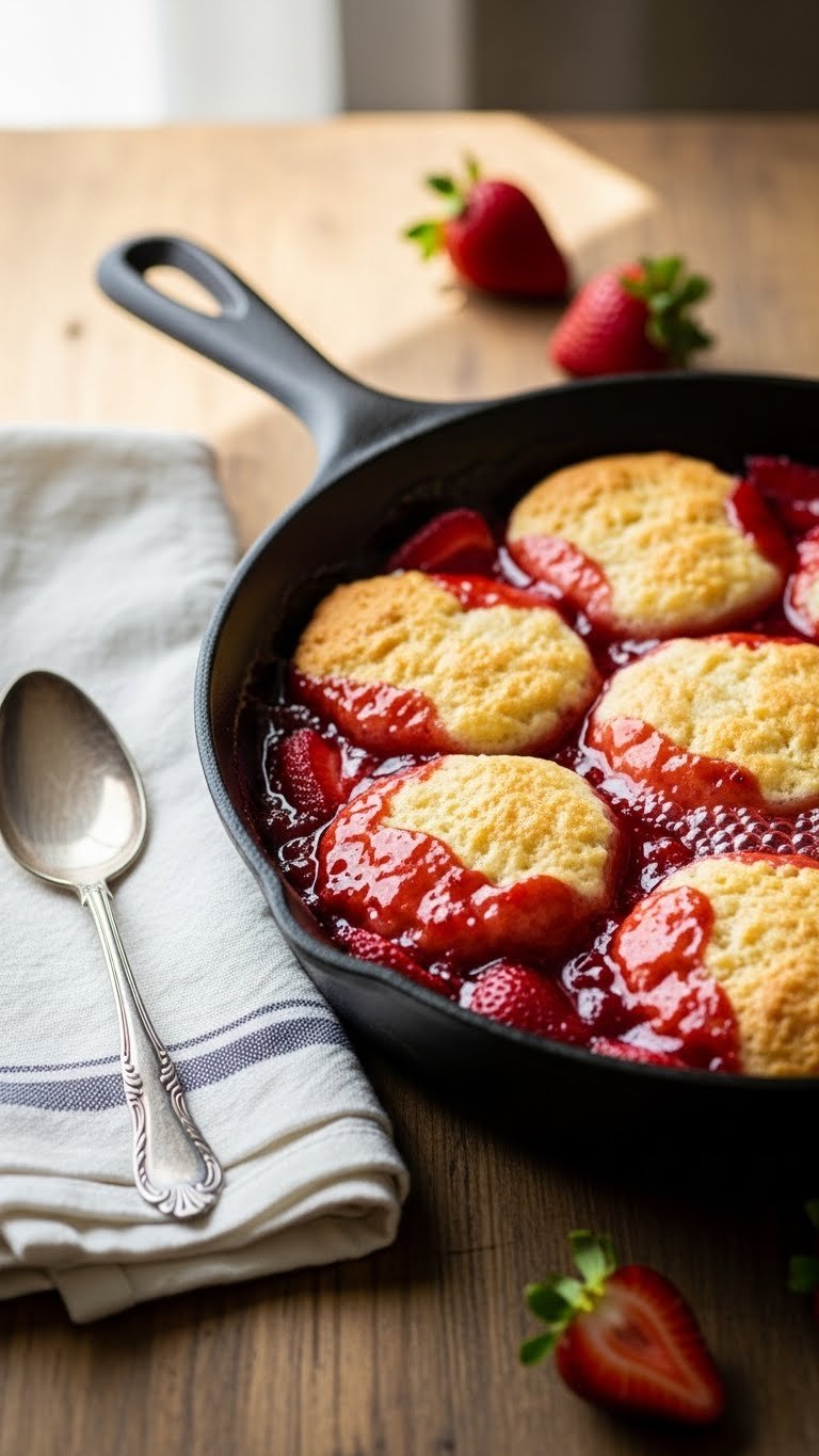 Serve straight from the skillet for a rustic look. Add a scoop of vanilla ice cream or a dollop of whipped cream. Garnish with a few fresh strawberry halves and mint leaves. Pair with cold milk or a late-summer white wine. Refrigerate leftovers in an airtight container for up to 3 days; reheat gently in a 325°F oven. Make ahead by prepping fruit and chilling biscuit dough separately.