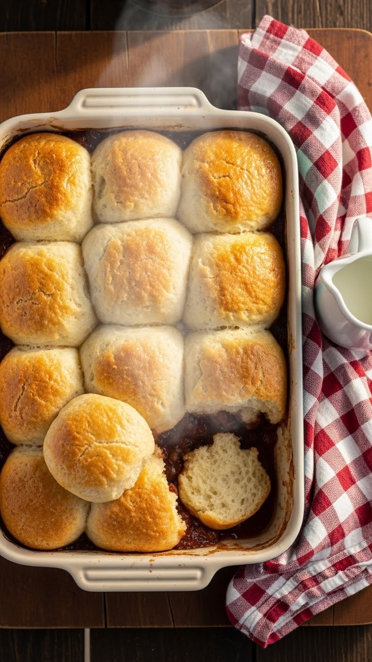 - Bake 38–42 minutes until biscuits are golden-brown and filling is bubbly.