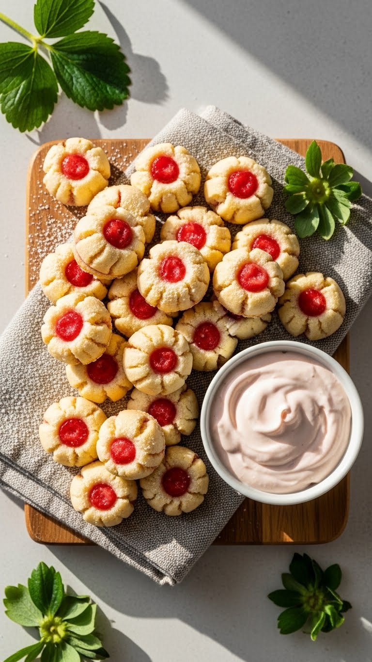 These mini cookies are tiny sweet bites with a creamy tang. They bake quickly and are perfect for parties or lunchboxes. Texture is pillowy with a slightly crisp edge and gooey center. Kids and snackers love these little treats. Expect bright strawberry bursts in every bite.