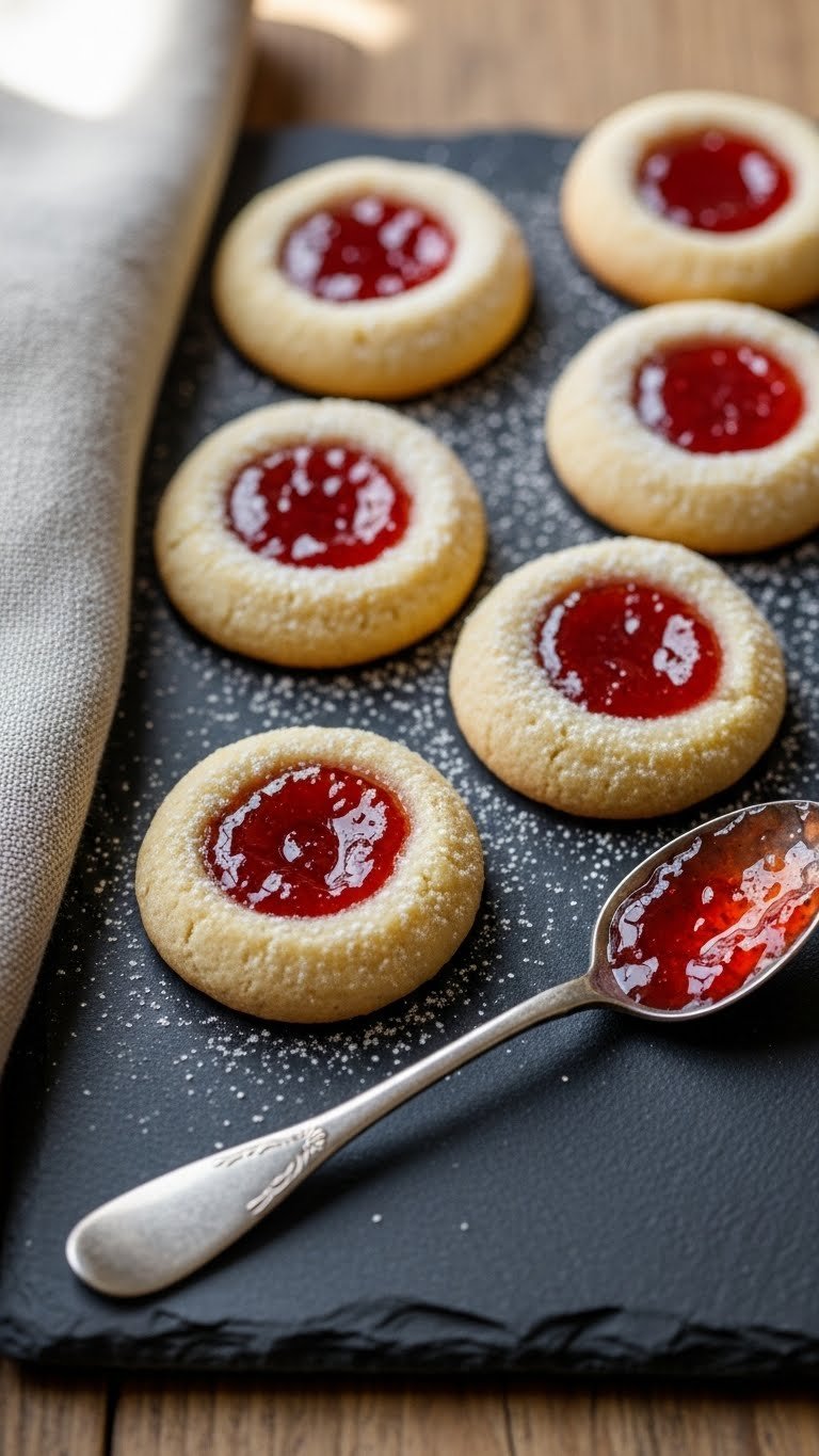 Arrange on a decorative platter and add fresh mint sprigs for color. Pair with tea, coffee, or a light dessert wine. Store in an airtight container at room temperature for 2–3 days; refrigerate up to 5 days. Make jam-filled cookies a day ahead — they keep well and flavors meld.