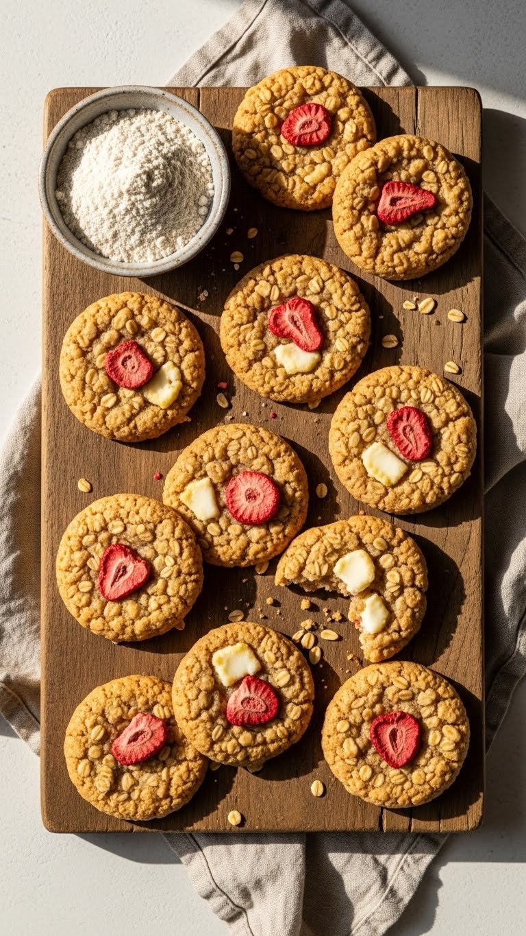 These cookies are hearty and chewy from oats, with tender pockets of cream cheese and strawberry. They use gluten-free flour and oats for a rustic texture. The flavor is warm, slightly nutty, and bright. Ideal for gluten-sensitive guests and cozy mornings. You’ll love the chew and little strawberry bursts.