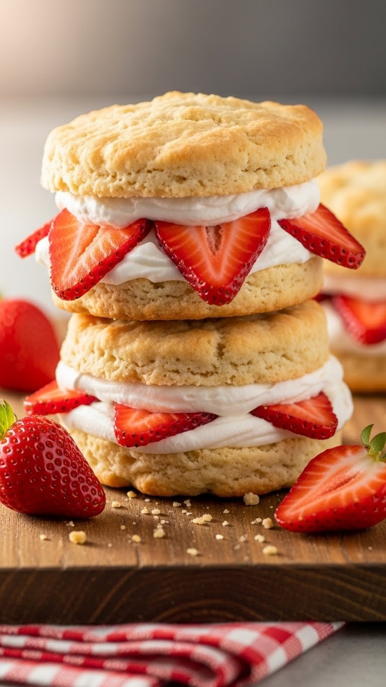 Serve the shortcake-style cookies on a dessert plate with extra strawberries. Dust with powdered sugar for a pretty finish. Pair with chilled prosecco or a garden cocktail. Assemble just before serving to keep whipped cream fluffy. Store unassembled in an airtight container for 2 days; fill right before serving.