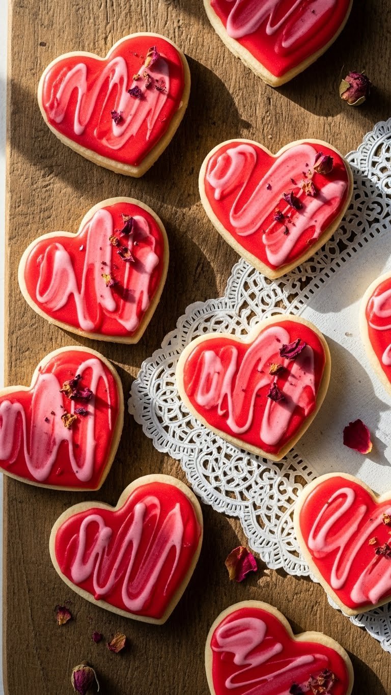 Present on a heart-shaped platter or wrap as gifts tied with twine. Pair with hot chocolate or a fragrant tea. Store in an airtight container at room temperature for 3 days. Decorated cookies keep better when stored flat and layered with parchment.