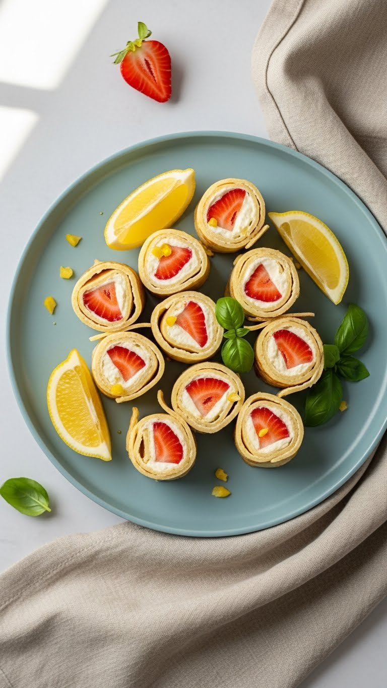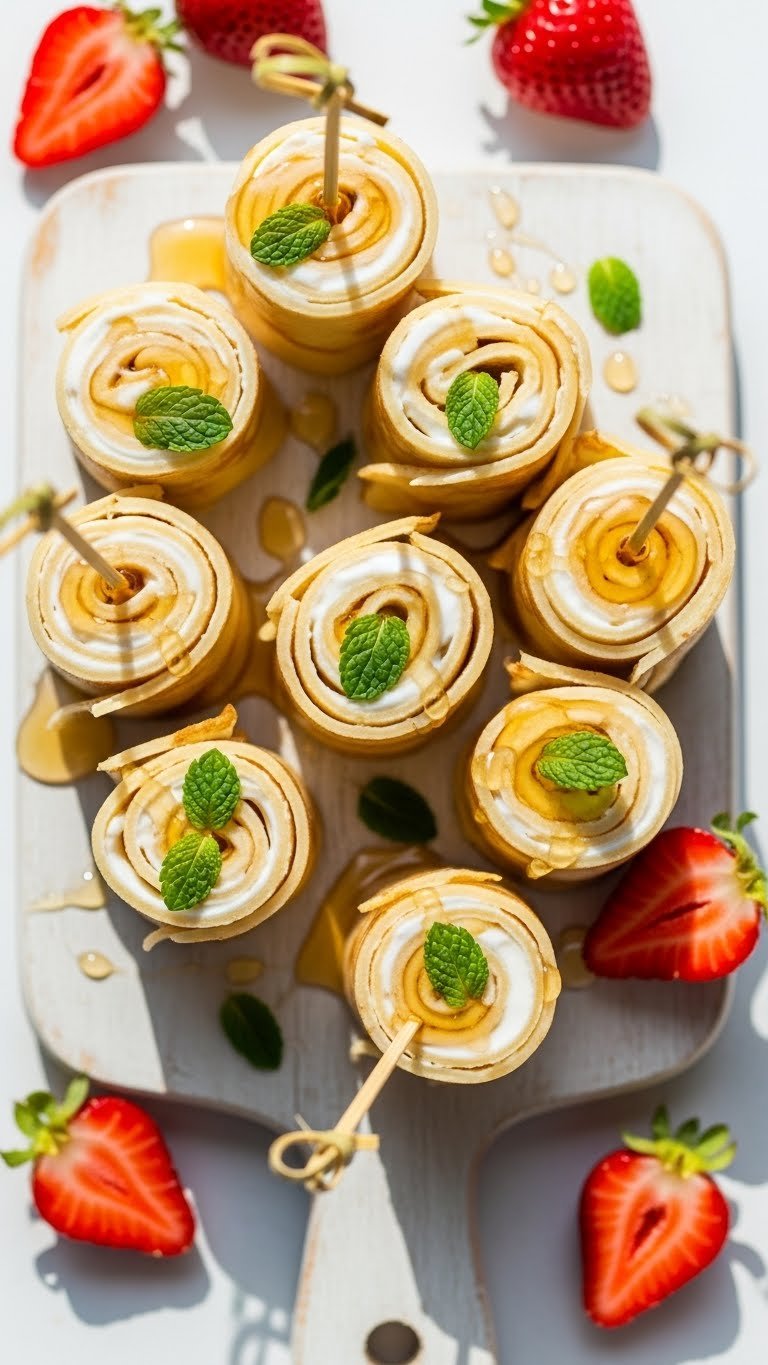 Small, party-style bites that are easy to pick up and eat. Mini crepes are rolled with honey-sweetened yogurt and strawberry slivers for a refreshing bite. They’re perfect for a brunch appetizer or finger-food table. Light, tangy, and sweet—great for mingling. Expect creamy yogurt and bright berry pops.