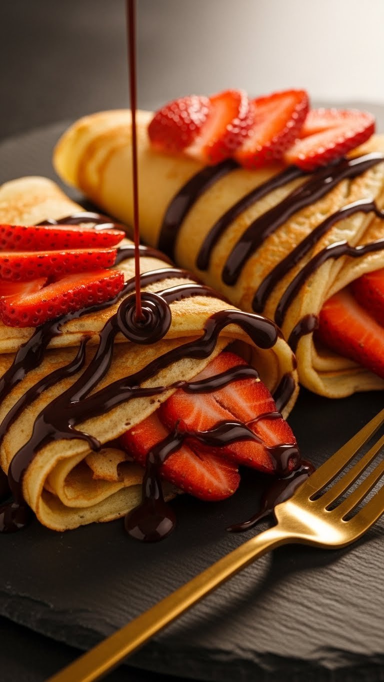 - Fill crepes with strawberries, fold, and drizzle chocolate sauce.